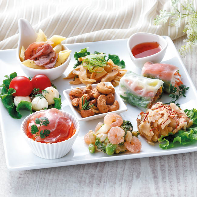ミニトマト&モッツァレラチーズジュレ掛け、サーモンの生春巻き、牛焼肉の生春巻き、スイートチリソース、カシューナッツ(ガーリックソース)、蒸し鶏ザーサイ、ガーリックペンネ&パストラミポーク、キャロットラペ&生ハム、海老とブロッコリーのサラダ、九条ねぎとメンマの和え物