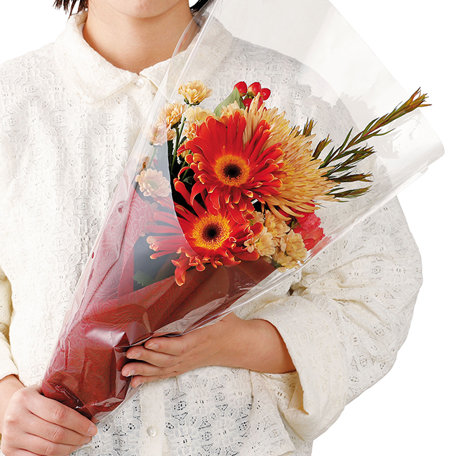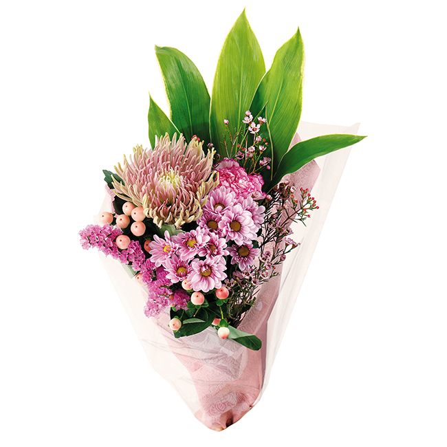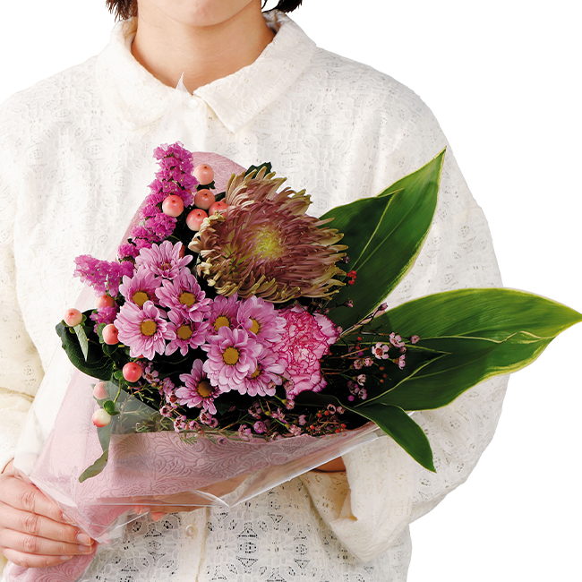 長さ約50cm 花・長く楽しめる洋菊を中心に季節のグリーン等上品に束ねた和モダンブーケです。ご自宅使いのフラワーインテリアとして長く楽しめます。※季節により花の内容は変わります。
