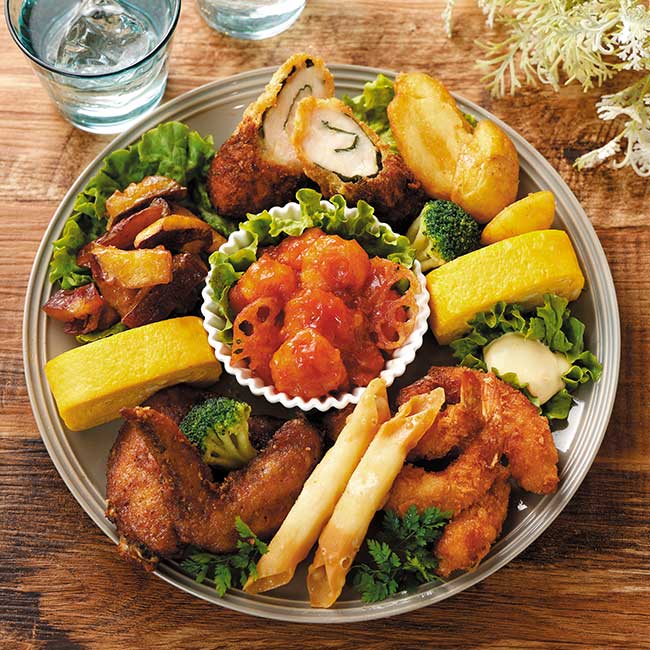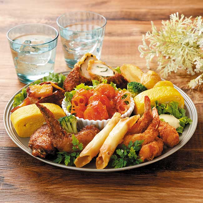 ねぎ油香る海老チリソース、手羽先からあげ、ささみ大葉かつ(たれ付)、サクサクチーズ揚、蜂蜜ひとくち大学いも、厚焼玉子、ぷりぷり海老の薄衣揚、ブロッコリー、皮付きポテト、蓮根チップ