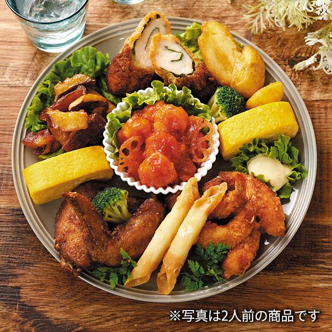 ねぎ油香る海老チリソース、手羽先からあげ、ささみ大葉かつ(たれ付)、サクサクチーズ揚、蜂蜜ひとくち大学いも、厚焼玉子、ぷりぷり海老の薄衣揚、ブロッコリー、皮付きポテト、蓮根チップ