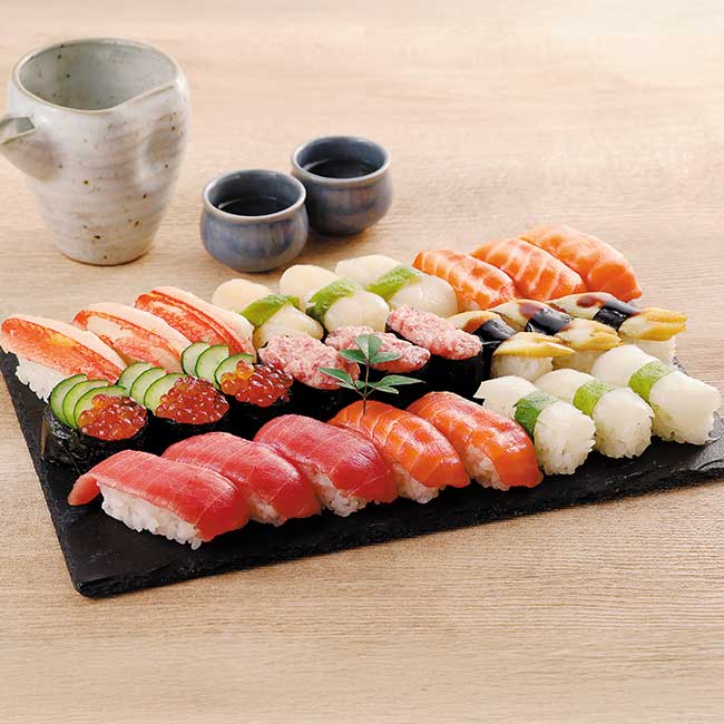 本鮪、生サーモン、北海道産ほたてなどを使用した3人前相当の握り寿司盛合せです。