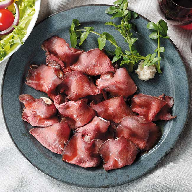 国産牛のモモ肉を使用した、しっとりと柔らかいローストビーフです。